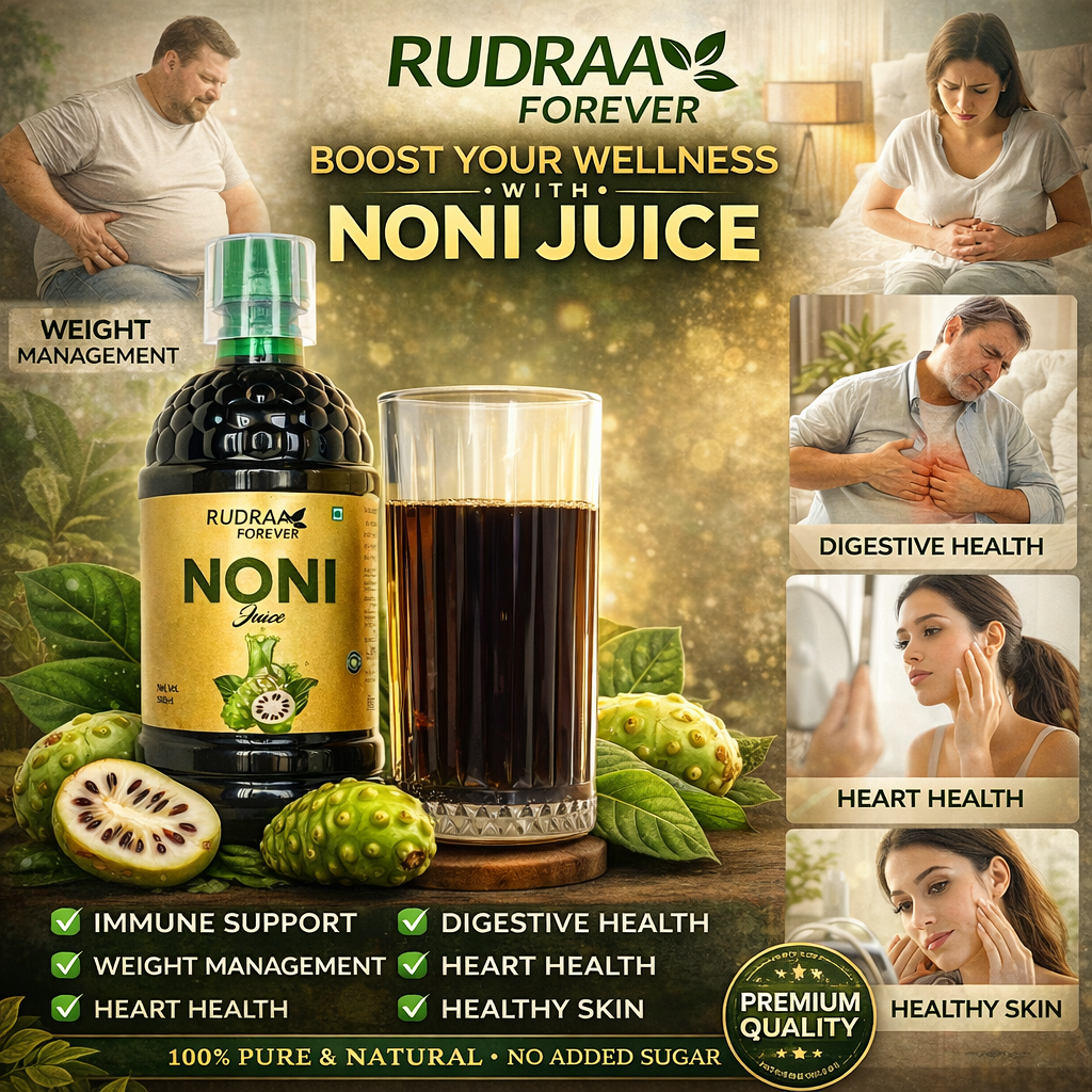 Rudraa Forever Noni Juice is made from pure, fresh Noni extract blended with essential herbs to rejuvenate your body, boost immunity, and improve overall vitality.This Ayurvedic health tonic helps detoxify the body, enhance digestion, and maintain natural energy levels — keeping you active, healthy, and stress-free every day.