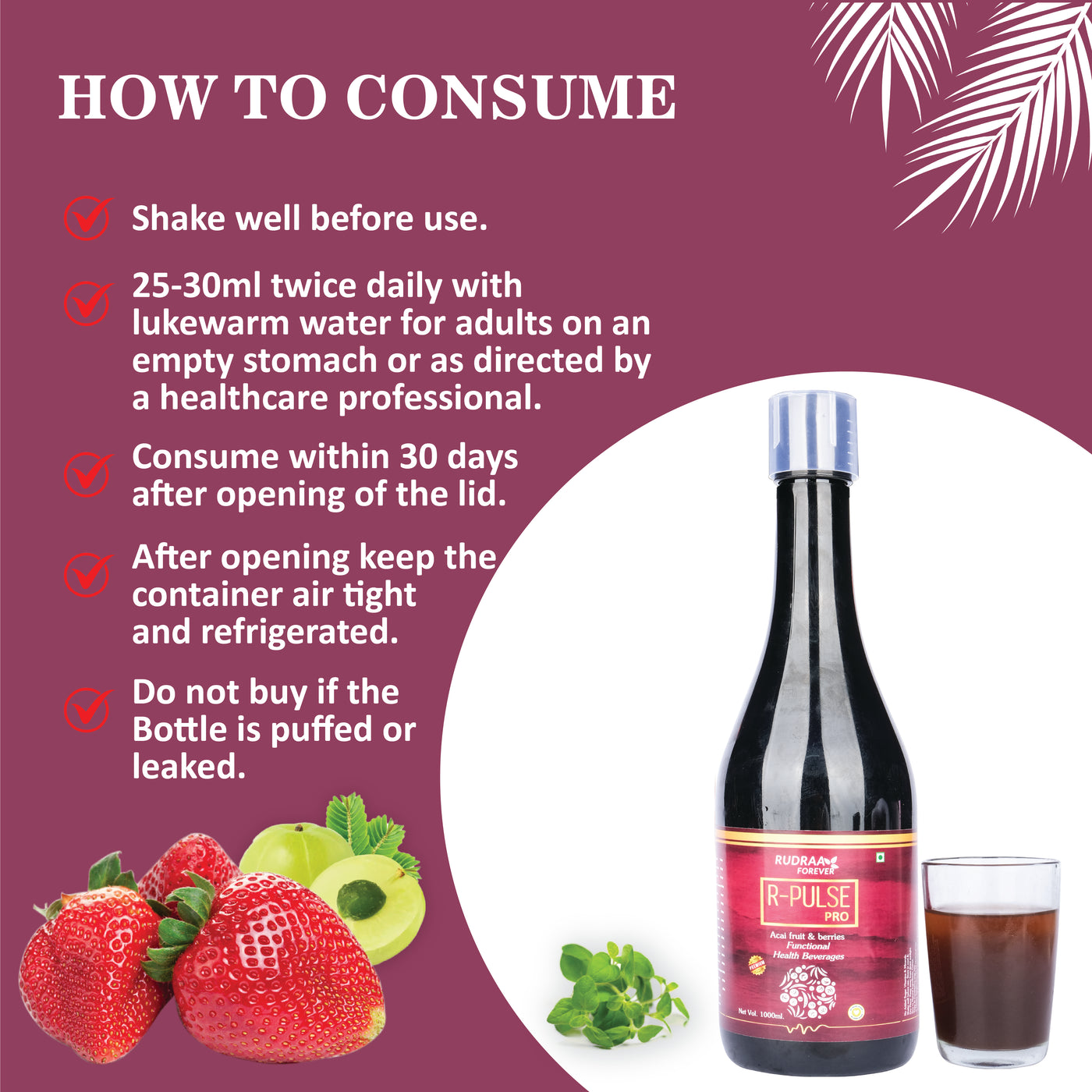 R-Pulse Pro is a product made from 36 berries.Rudraa forever R-Pulse Pro juice contains the goodness of different berries that are beneficial for overall health. From boosting immunity to weight loss, there are several other benefits of R-Pulse Pro juice. Enjoy its benefits.