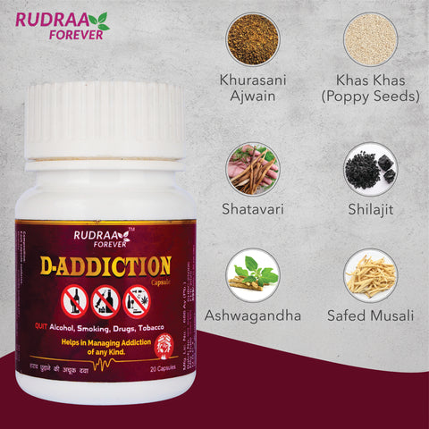D-Addiction Capsule is a specialized herbal formulation designed to help reduce cravings and support a healthy lifestyle. It assists in managing dependency habits naturally, promotes mental balance, and helps restore overall well-being.