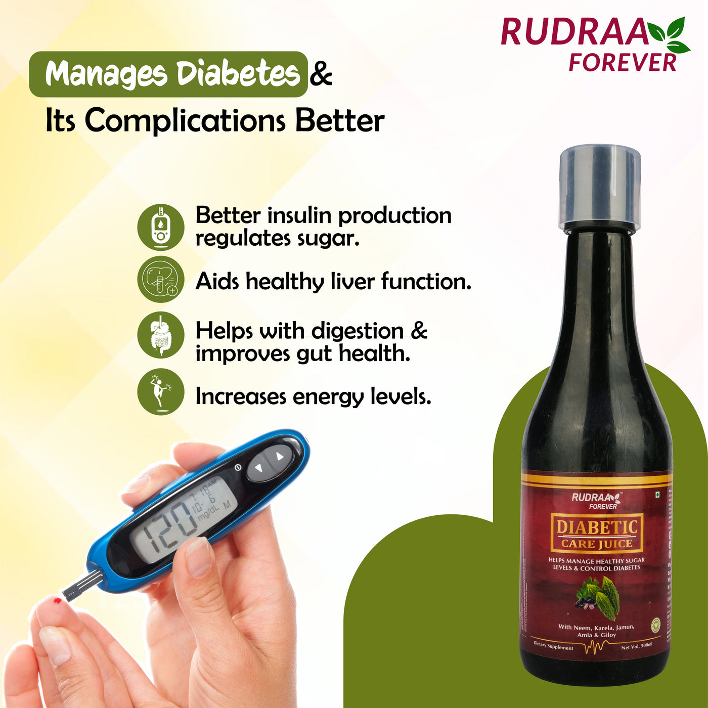 Rudraa Forever Diabetic Care Juice is aunique combination of Nutritional Rich & herbs viz Aloevera, Amla, Karela & Jamun.
