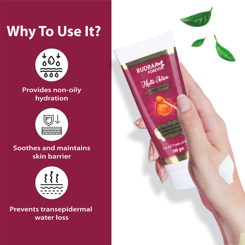 Multi Action Cream is a versatile skincare cream formulated to provide deep nourishment, hydration, and protection. Enriched with natural ingredients, it helps soften the skin, reduce dryness, and maintain a healthy, glowing complexion. Suitable for daily use on all skin types.